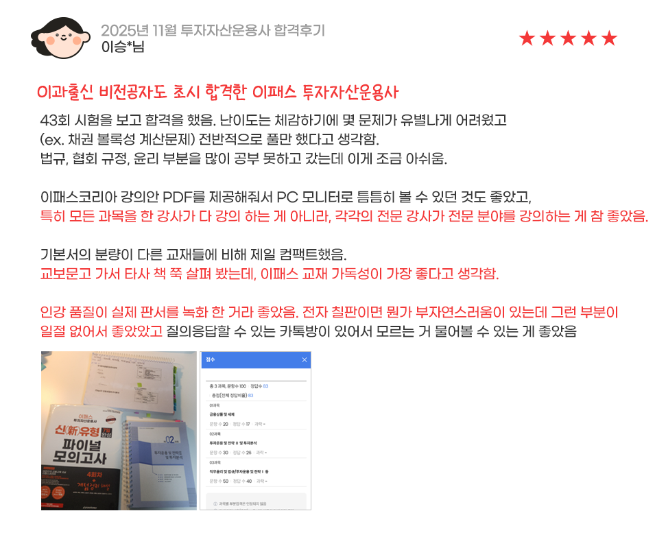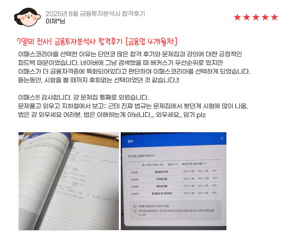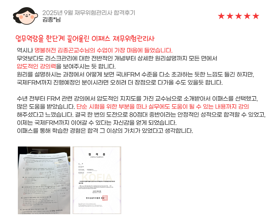 이벤트안내홈>커뮤니티>이벤트안내 진행중 🎁 다 퍼주는 2026 금융투자 신년이벤트 🎁 이벤트 기간: 2026.01.13 ~ 2026.02.27 조회수: 755 김호진 2025년 10월 투자자산운용사 백민종 2025년 10월 투자자산운용사 이승규 2025년 10월 투자자산운용사 이종진 2025년 10월 투자자산운용사 정주연 2025년 10월 투자자산운용사 최세영 2025년 10월 투자자산운용사 홍유찬 2025년 10월 투자자산운용사 강문원 2025년 9월 재무위험관리사 강수민 2025년 9월 재무위험관리사 권이주 2025년 9월 재무위험관리사 김재현 2025년 9월 재무위험관리사 김종훈 2025년 9월 재무위험관리사 김태윤 2025년 9월 재무위험관리사 박대원 2025년 9월 재무위험관리사 박선의 2025년 9월 재무위험관리사 심예린 2025년 9월 재무위험관리사 안은정 2025년 9월 재무위험관리사 안준우 2025년 9월 재무위험관리사 염은서 2025년 9월 재무위험관리사 오창후 2025년 9월 재무위험관리사 이대영 2025년 9월 재무위험관리사 정재헌 2025년 9월 재무위험관리사 정주용 2025년 9월 재무위험관리사 조경진 2025년 9월 재무위험관리사 차영기 2025년 9월 재무위험관리사 채정재 2025년 9월 재무위험관리사 최대혁 2025년 9월 재무위험관리사 최우리 2025년 9월 재무위험관리사 황주희 2025년 9월 재무위험관리사 강민혁 2025년 8월 금융투자분석사 강수진 2025년 8월 금융투자분석사 강찬우 2025년 8월 금융투자분석사 문시도 2025년 8월 금융투자분석사 박경호 2025년 8월 금융투자분석사 서주영 2025년 8월 금융투자분석사 손정해 2025년 8월 금융투자분석사 양기윤 2025년 8월 금융투자분석사 유경국 2025년 8월 금융투자분석사 윤소영 2025년 8월 금융투자분석사 이민재 2025년 8월 금융투자분석사 정정룡 2025년 8월 금융투자분석사 최대혁 2025년 8월 금융투자분석사 증권투자권유대행인 펀드투자권유대행인 증권투자권유자문인력 펀드투자권유자문인력 파생상품투자권유자문인력 투자자산운용사 금융투자분석사 재무위험관리사 목록 나도한마디(100자이내)(0/100) 등록 추천하기 ★★★★★ ★★★★☆ ★★★☆☆ ★★☆☆☆ ★☆☆☆☆ ☆☆☆☆☆ < 1 >
