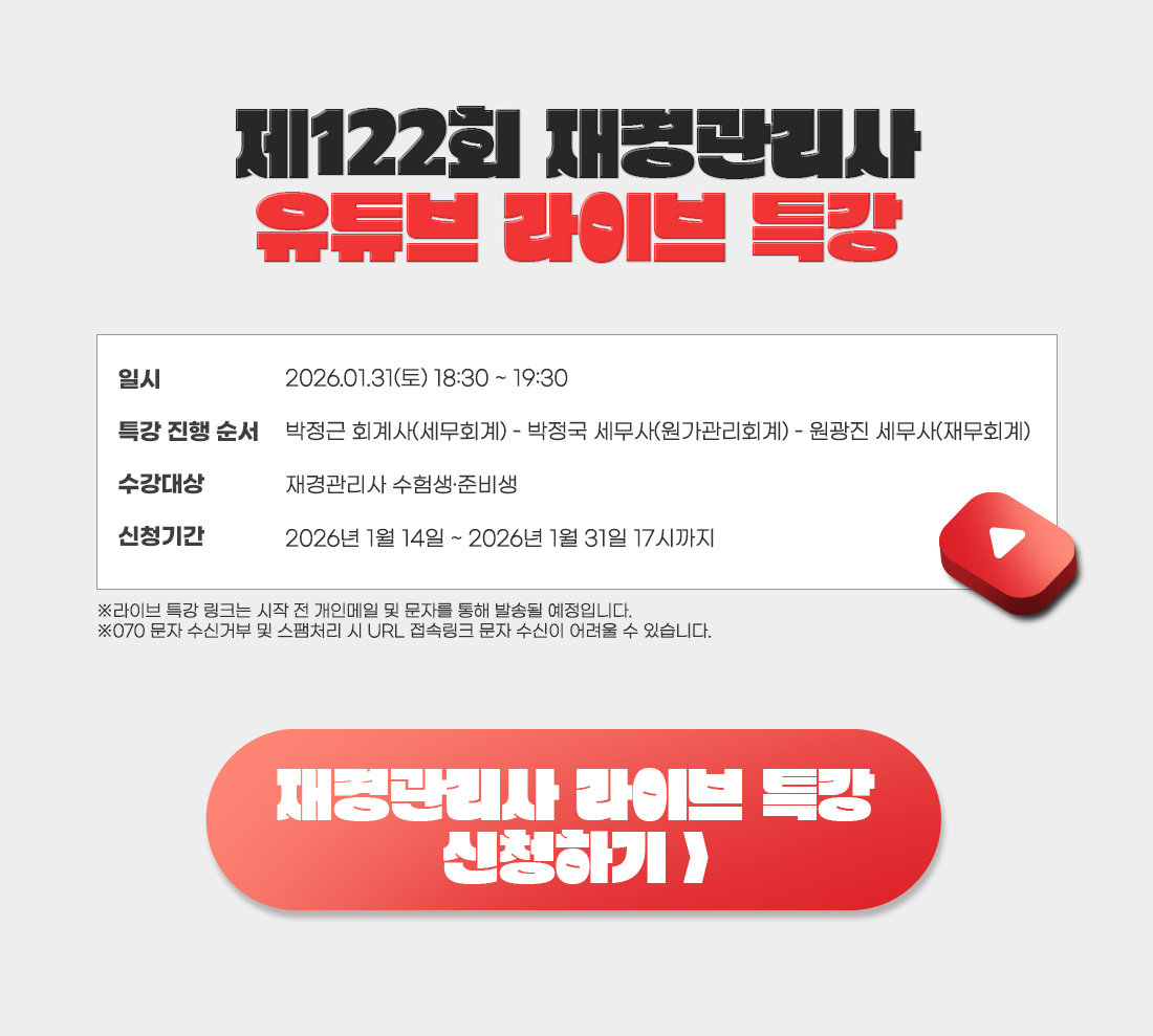 로그인 | 회원가입 | 이벤트3 | 마이페이지 | 내 강의실 | 온라인서점 | 내일배움 | 커뮤니티 | 고객 센터 공지사항 업데이트안내 기출문제복원 취업정보 할인쿠폰받기 Best 후기 이벤트안내 무료동영상 CFA 캠페인 평생교육이용권