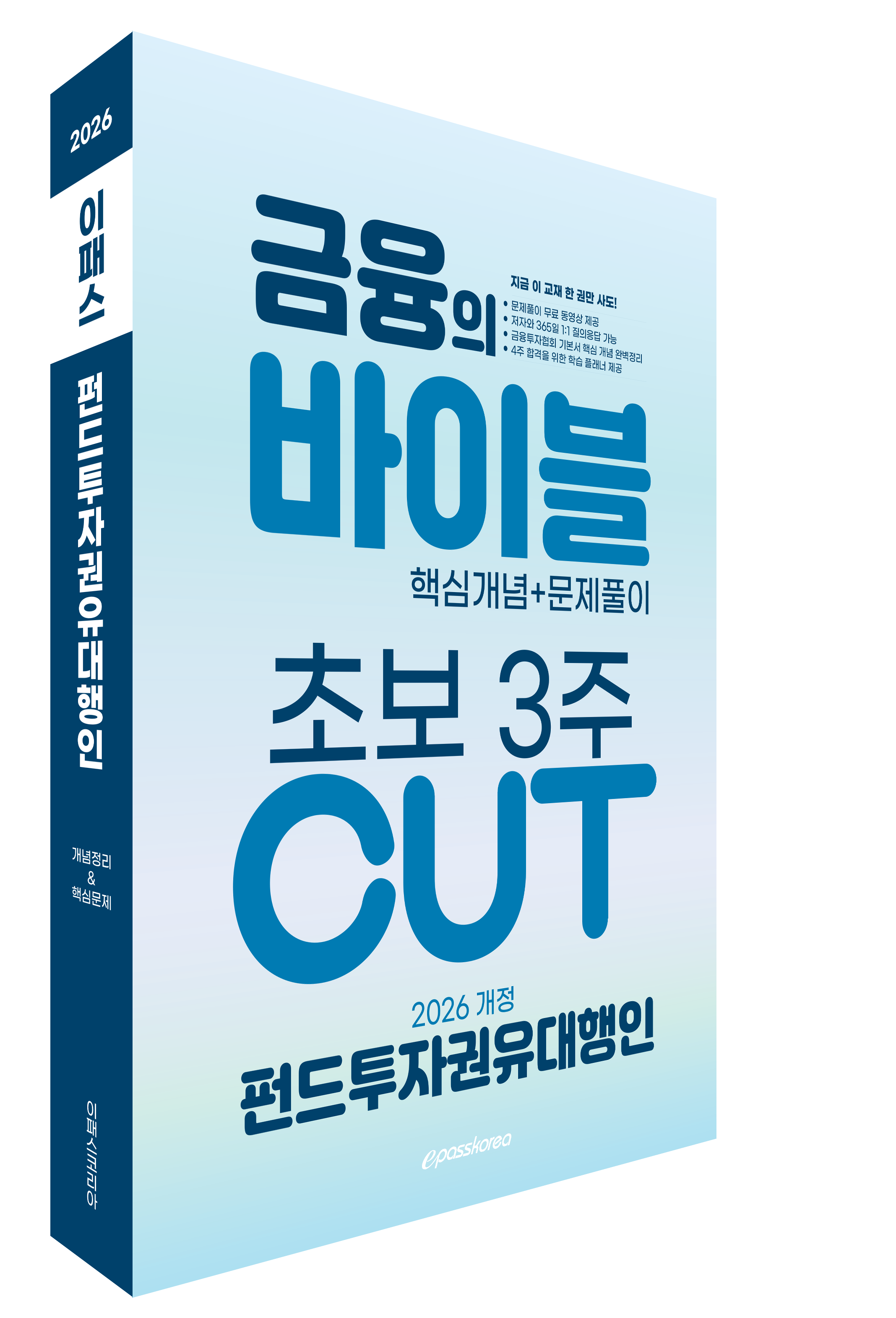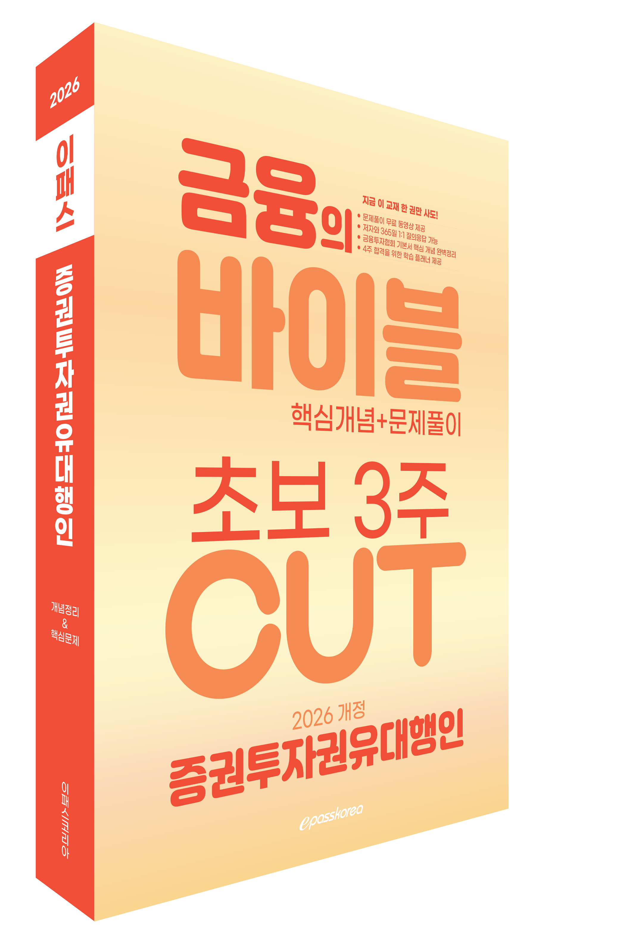 온라인서점국제자격도서 - CFA - FRM - CAIA - CAMS금융투자자격도서 - 증권금융기초입문 - 펀드투자권유대행인 - 증권투자권유대행인 - 펀드투자권유자문인력 - 증권투자권유자문인력 - 파생상품투자권유자문인력 - 투자자산운용사 - 금융투자분석사 - 재무위험관리사은행/무역/보험자격도서 - 자산관리사(은행 FP) - 은행텔러 - 외환전문역 - 국제무역사/무역영어 - 원산지관리사 - AFPK - CFP - 보세사 - 물류관리사 - 유통관리사 2급 - 신용분석사 - TPAC금융일반도서 - 금융일반세무회계자격도서 - 전산세무/회계 - 세무회계 - TAT/FAT - 재경/회계관리사 - IFRS관리사 - 세무/회계 실무기술자격증도서 - 공조냉동기계 - 정보통신 - 실내건축 - 자동차정비 - 용접 - 에너지관리 - 소방설비 - 식물보호 - 산업위생관리 - 산업안전 - 건설안전 - 산업안전지도사 - 전기 - 가스 - 수질환경 - 컴퓨터활용능력한국사도서 - 한국사능력검정시험소방승진 - 소방전술 - 소방공무원법 - 소방법령II - 위험물안전관리법 - 다중이용업소법 - 행정법 - 봉투 모의고사 - 가산점 고객센터 교육문의 1600-0522 평일 09:00~21:00 토/일요일 09:00~18:00 담당자별 내선보기 온라인서점 바로가기 강의 교재 구매홈>온라인서점>금융투자자격도서 - 신청하신 교육과정의 교재를 구매하 실 수 있습니다. 2026 증권투자권유대행인 2 편저 : 금융투자교육원 (http://www.kifin.or.kr/) 발행처 : 한국금융투자협회 (http://license.kofia.or.kr/) 출판사: 금융투자교육원|출판년도: 2026년 25,000원 25,000원 0원 구매하기 장바구니담기 2026 펀드투자권유대행인 편저 : 금융투자교육원 (http://www.kifin.or.kr/) 발행처 : 한국금융투자협회 (http://license.kofia.or.kr/) 출판사: 금융투자교육원|출판년도: 2026년 32,000원 32,000원 0원 구매하기 장바구니담기 2026 이패스 증권투자권유대행인 금융의 바이블 3주 CUT 핵심정리문제집 ▲ 교재: 2026 상반기~ 2027 상반기 증권투자권유대행인 대비 3주 CUT 합격문제집 ▲ 교재내용 : 핵심문제+개념정리+실전모의고사 ▲ 페이지 수 : 504 ▲ 특징 : 2026 개정사항 + 최신 기출트렌드가 완벽 반영된 교재 출판사: 이패스코리아|출판년도: 2026년 21,000원 21,000원 0원 구매하기 장바구니담기 2026 이패스 펀드투자권유대행인 금융의 바이블 3주 CUT 핵심정리문제집 출판사: 이패스코리아|출판년도: 2026년 21,000원 21,000원 0원 구매하기 장바구니담기 < 1 2 3 4 5 6 7 8 9 10 >