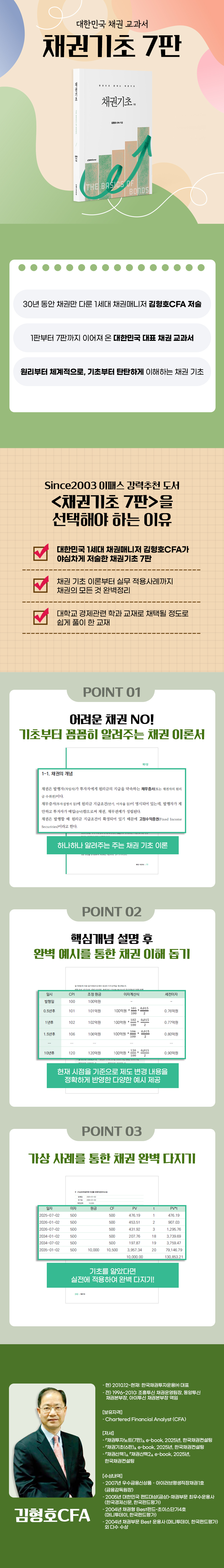 온라인서점국제자격도서 - CFA - FRM - CAIA - CAMS금융투자자격도서 - 증권금융기초입문 - 펀드투자권유대행인 - 증권투자권유대행인 - 펀드투자권유자문인력 - 증권투자권유자문인력 - 파생상품투자권유자문인력 - 투자자산운용사 - 금융투자분석사 - 재무위험관리사은행/무역/보험자격도서 - 자산관리사(은행 FP) - 은행텔러 - 외환전문역 - 국제무역사/무역영어 - 원산지관리사 - AFPK - CFP - 보세사 - 물류관리사 - 유통관리사 2급 - 신용분석사 - TPAC금융일반도서 - 금융일반세무회계자격도서 - 전산세무/회계 - 세무회계 - TAT/FAT - 재경/회계관리사 - IFRS관리사 - 세무/회계 실무기술자격증도서 - 공조냉동기계 - 정보통신 - 실내건축 - 자동차정비 - 용접 - 에너지관리 - 소방설비 - 식물보호 - 산업위생관리 - 산업안전 - 건설안전 - 산업안전지도사 - 전기 - 가스 - 수질환경 - 컴퓨터활용능력한국사도서 - 한국사능력검정시험 고객센터 교육문의 1600-0522 평일 09:00~21:00 토/일요일 09:00~18:00 담당자별 내선보기 온라인서점 바로가기 강의 교재 구매홈>온라인서점>금융투자자격도서 채권기초 7판 교재명 채권기초 7판 출판사/저자 이패스코리아 /김형호 출판년도 2026년 페이지수 336페이지 정가 22,000원 회원가 22,000원 적립금 220원 주문상태 · 관련과목 관련과목 없음. 바로구매 장바구니 담기 목록 안내 및 도서소개 목차 안내 ▲ 교재: 채권의 교과서! 김형호CFA의 최신 개정판 ▲ 교재내용 : 채권 기초부터 실무까지 정리 끝 ▲ 페이지 수 : 336 도서소개 목차 제1장 채권개요제2장 국채, 지방채, 특수채, 회사채, ABS제3장 채권시장제4장 돈의 시간가치(Time Value of Money)제5장 채권금리와 채권가격제6장 채권수익률곡선제7장 듀레이션과 Convexity제8장 채권의 금리변동위험제9장 채권의 신용위험제10장 주식관련사채제11장 채권세제제12장 해외채권투자