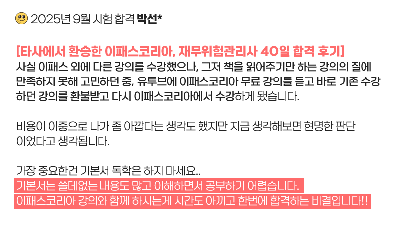 이벤트안내홈>커뮤니티>이벤트안내 진행중 💗1위 이패스가 국내FRM 수강기간 연장&환급까지? 💗 이벤트 기간: 2026.02.25 ~ 2026.03.27 조회수: 155 완벽라인업빔 강의완벽 교재 강의 영상보기 강의 영상보기 강의 영상보기 목록 나도한마디(100자이내)(0/100) 등록 추천하기 ★★★★★ ★★★★☆ ★★★☆☆ ★★☆☆☆ ★☆☆☆☆ ☆☆☆☆☆ < 1 >