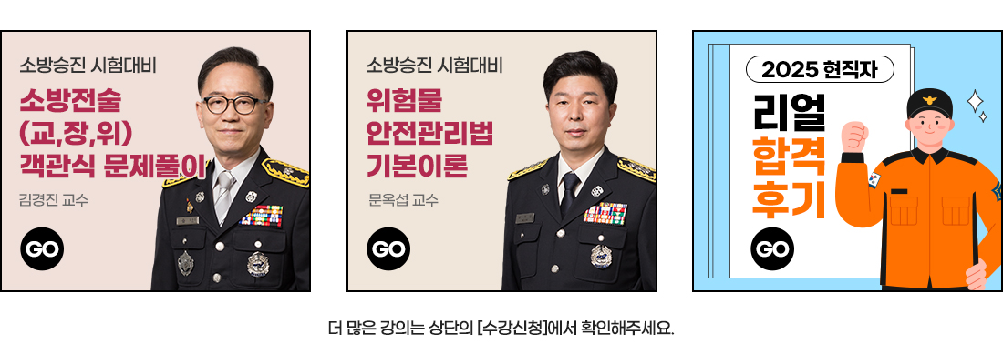 2024년도 시험을 준비를 시작으로 2025년도에도 교수님의 도움으로 소방장 시험에 합격했습니다. 생소한 위험물 내용을 쉽게 알려주셔서 감사합니다